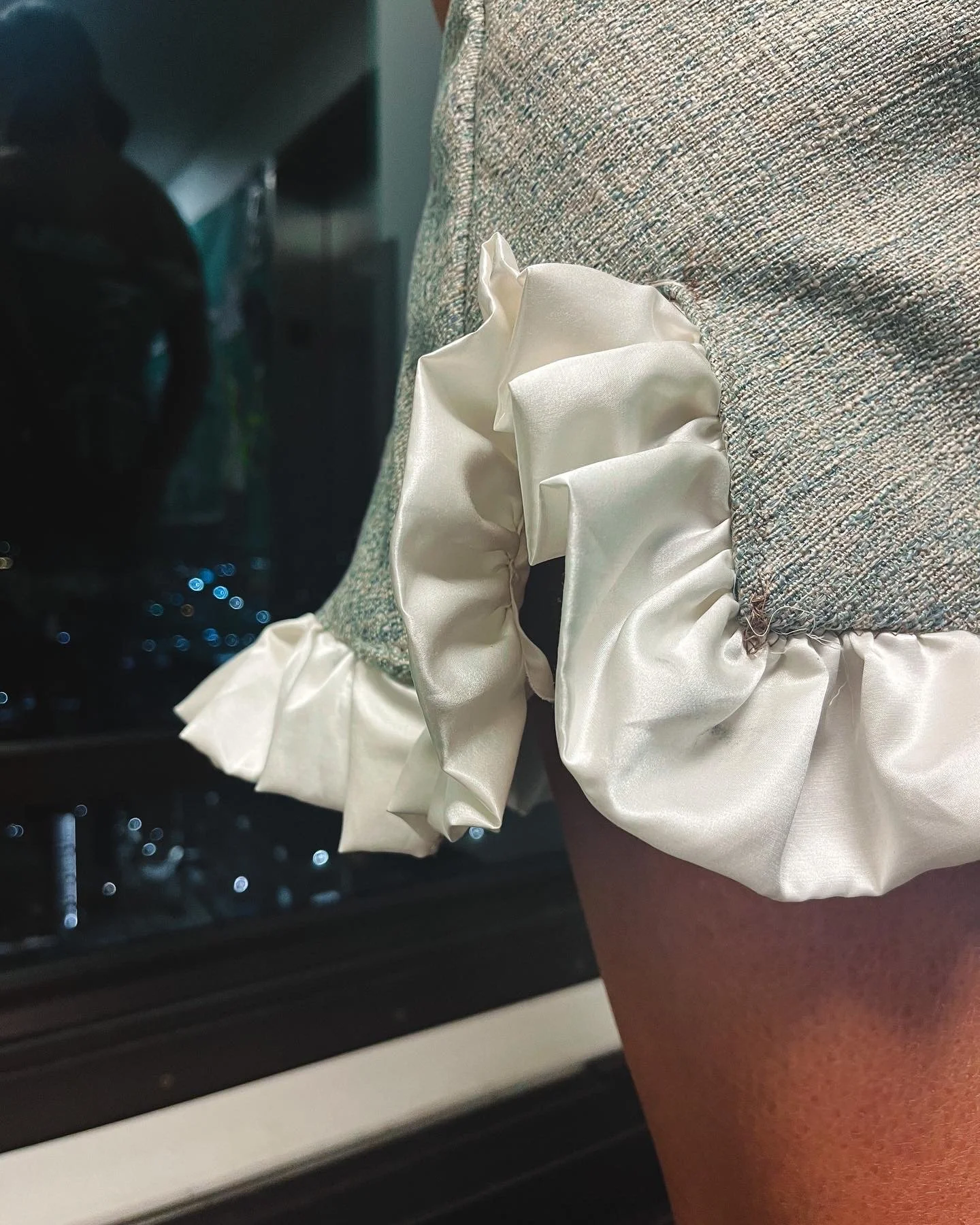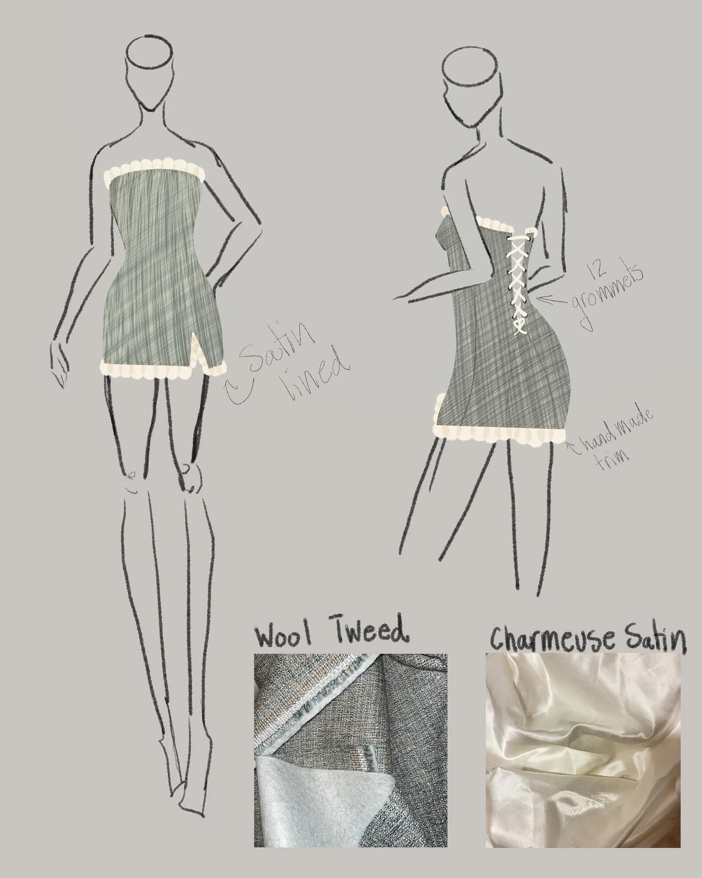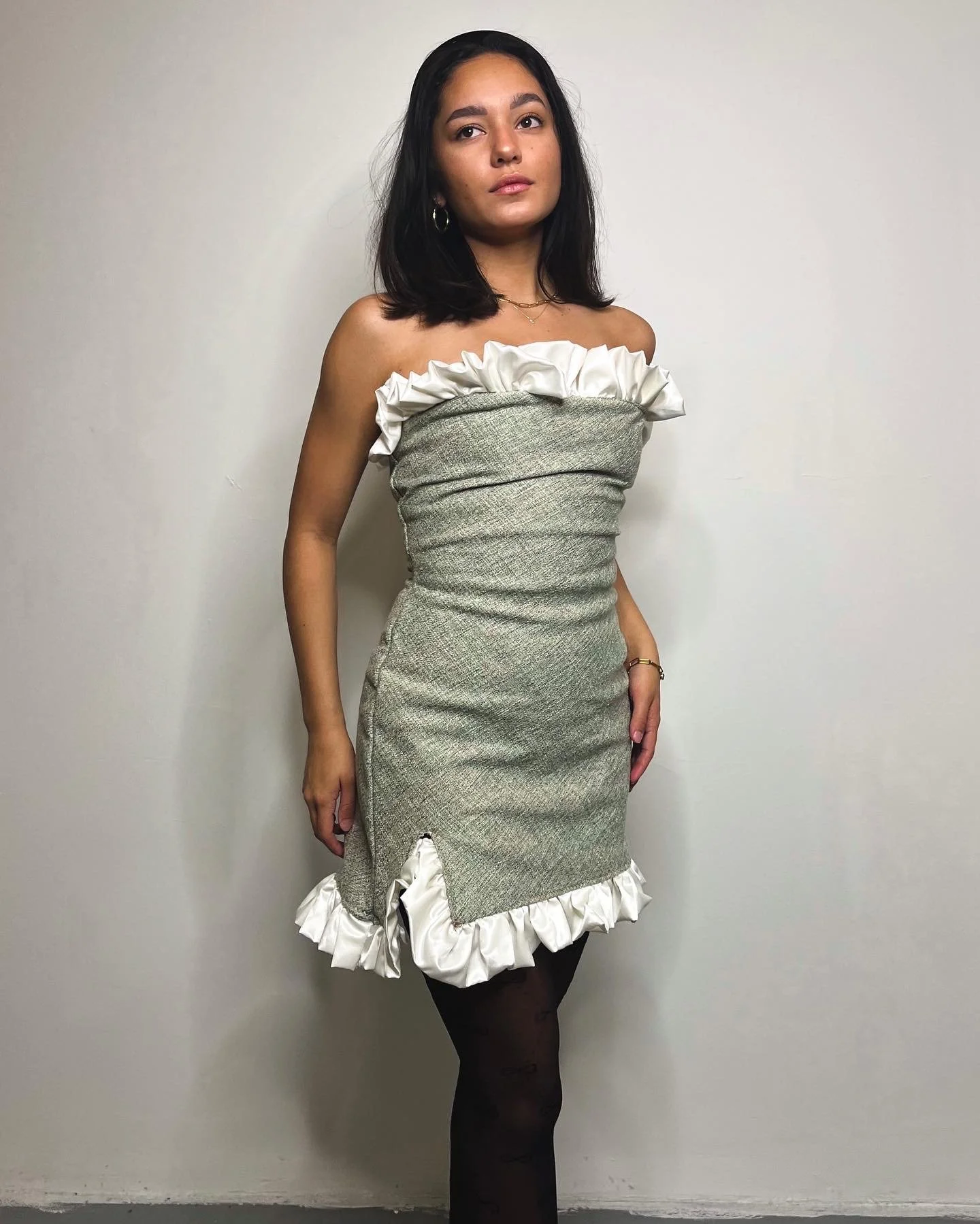 Tweed mini dress with charmeuse satin lining and ruffle detailing and lace up back closure with silver gromets.